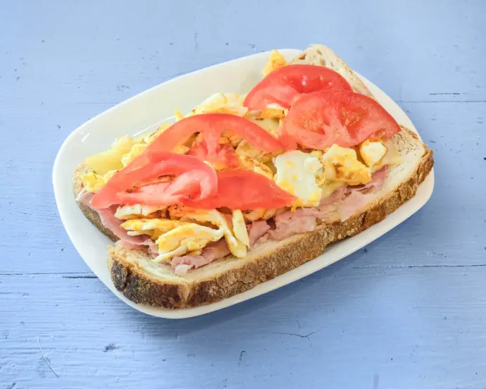 Jamón, queso, tomates, 2 huevos revueltos. Brunch de lujo.