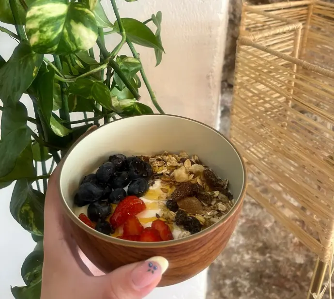 Yogur griego natural, cereal crujiente, fruta fresca. Energía pura para empezar el día.