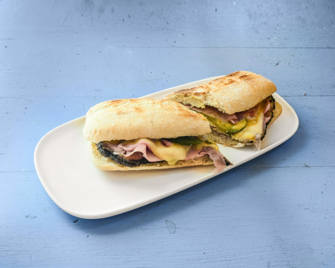 Carne mechada jugosa, jamón york, queso suizo, mostaza amarilla y pepinillos crujientes.