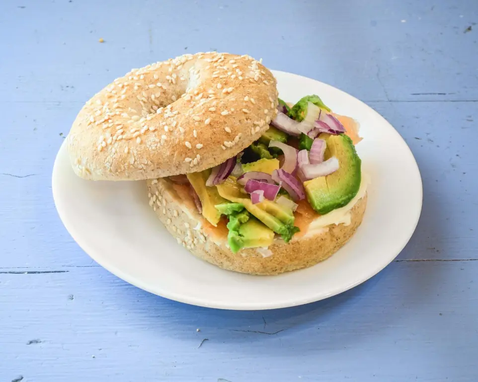 Aguacate, salmón ahumado, crema de queso, cebolla. Sofisticado y delicioso.