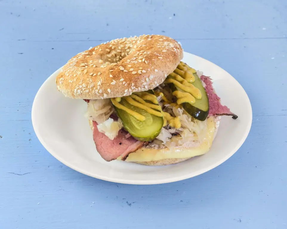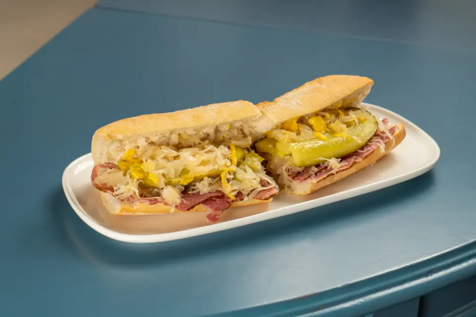 Pastrami tierno, chucrut casero, mostaza de Dijon, pepinillos. Puro sabor deli newyorkino.