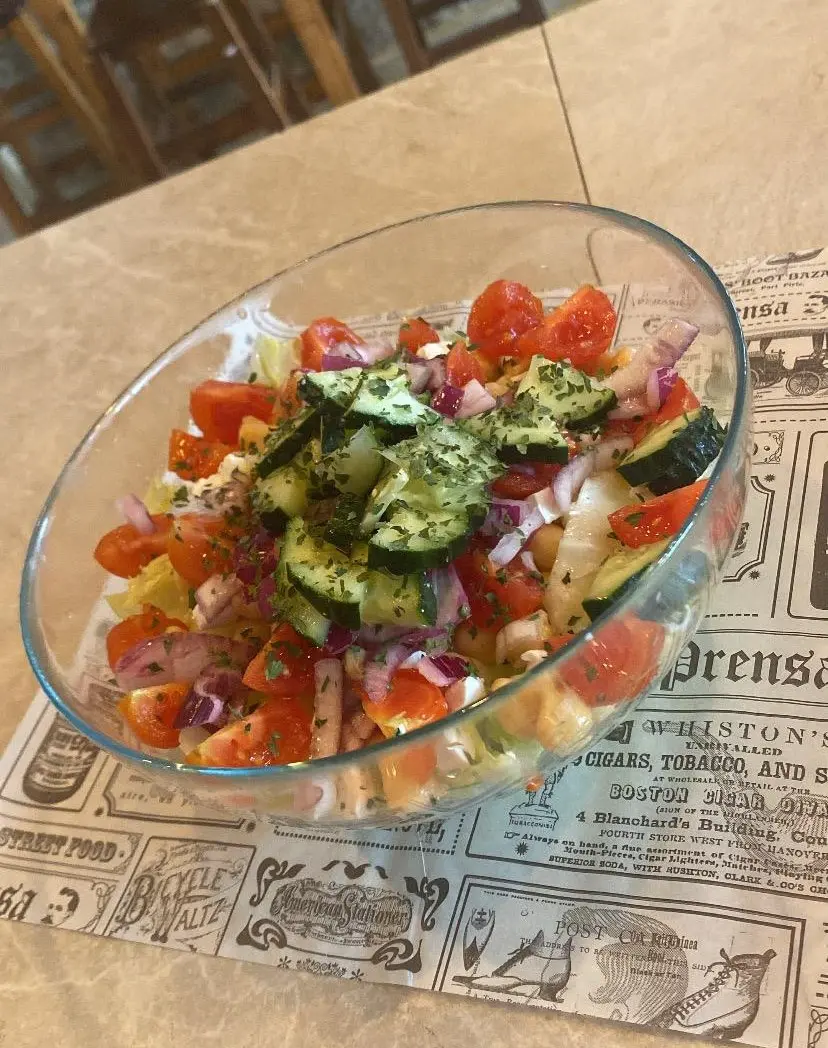 Garbanzos, lechuga, queso feta, limón, tomate cherry, cebolla, perejil, pepino. (+ Pollo opcional) Inspiración mediterránea.