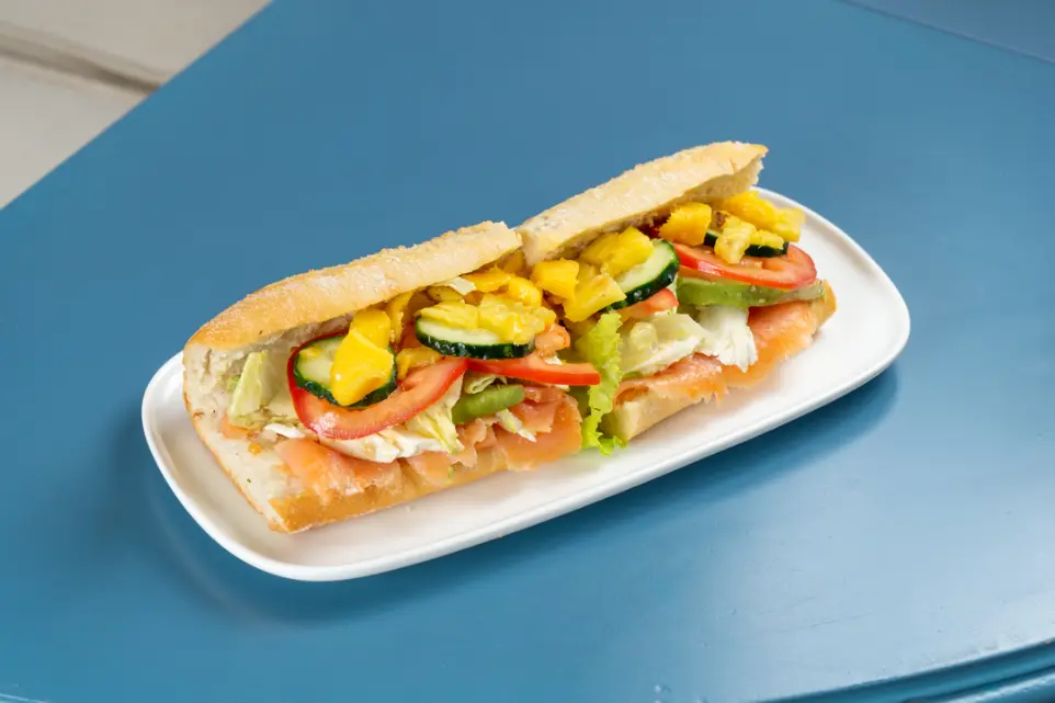 Salmón o pavo, aguacate, mozzarella, lechuga, tomate, pepino, mango, piña. Tropical en cada bocado.