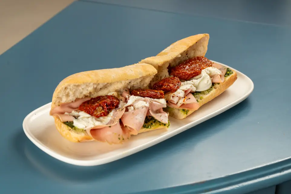 Pollo, pesto de albahaca, mozzarella fresca, tomate deshidratado. Sabor italiano con flow americano.